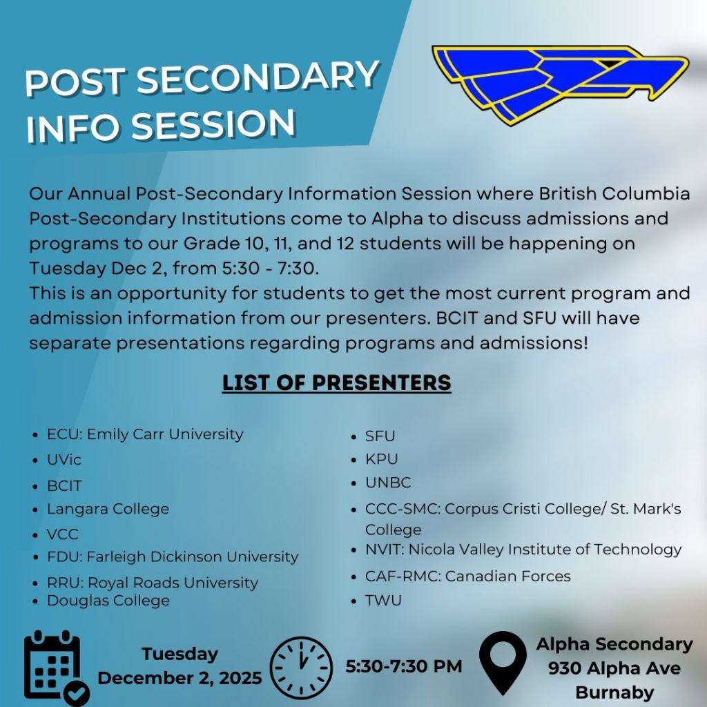 Post Secondary Info Session – Tuesday Dec 2nd 5:30-7:30pm