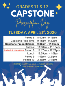 GRADES 8, 9 AND 10 STUDENTS will have a later start on Capstone Day. Please arrive in time for Period 8, which begins at 11:17 AM. There will be no Periods 6 or 7 classes for these grades.